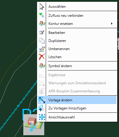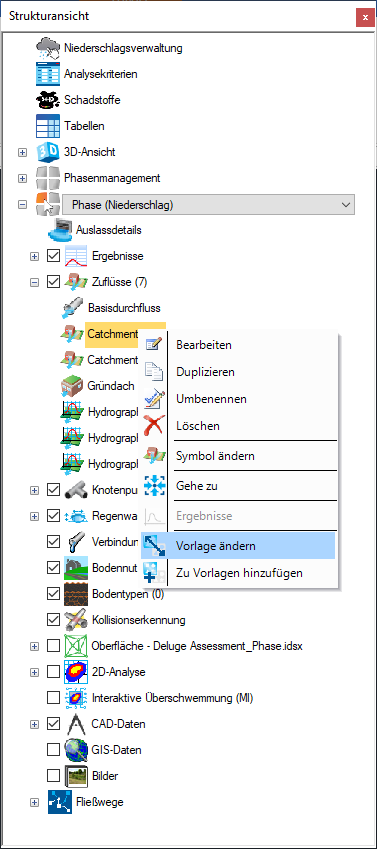 Sie können auf die Menüoption Vorlage ändern zugreifen, indem Sie entweder mit der rechten Maustaste auf die Einträge unter Zuflüsse, Knotenpunkte, Regenwassersteuerungen oder Landnutzungen in der Gruppe Strukturansicht klicken oder indem Sie mit der rechten Maustaste auf eines dieser Elemente (einschließlich Verbindungen) im Fenster Plan klicken. Beachten Sie, dass vor dem Aufrufen des Menüs Vorlage ändern mehrere Elemente ausgewählt werden können. Die Funktion ist jedoch nur verfügbar, wenn alle ausgewählten Elemente einem der folgenden Typen angehören: