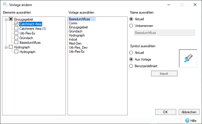 Wählen Sie im Dialogfeld Vorlage ändern die zu ändernden Objekte in der Struktur Ausgewählte Elemente aus (vorgabemäßig sind alle Elemente ausgewählt, die vor dem Öffnen des Menüs ausgewählt waren). Wählen Sie dann die entsprechende Vorlage für das ausgewählte Objekt aus. Das Symbol und die Beschriftung können außerdem an den Entwurf des Projekts angepasst werden. Beachten Sie, dass bei der Option Umbenennen mehrere Elemente nach einem sequenziellen Standardformat benannt werden (z. B. Einzugsgebiet, Einzugsgebiet (2), Einzugsgebiet (3)).