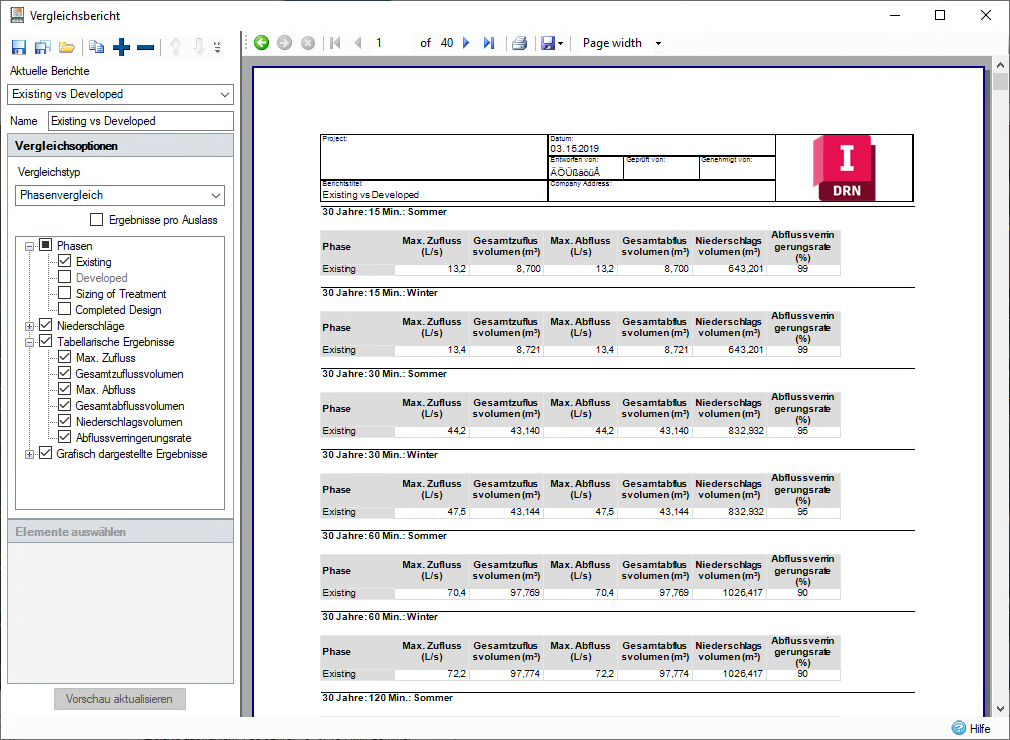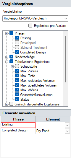 Mit dem Vergleichsbericht können Sie die Ergebnisse einzelner Verbindungen, Zuflüsse, Knotenpunkte oder Entwässerungssysteme in verschiedenen Phasen direkt vergleichen. Die Gesamtergebnisse der Phasen können ebenfalls verglichen werden.
