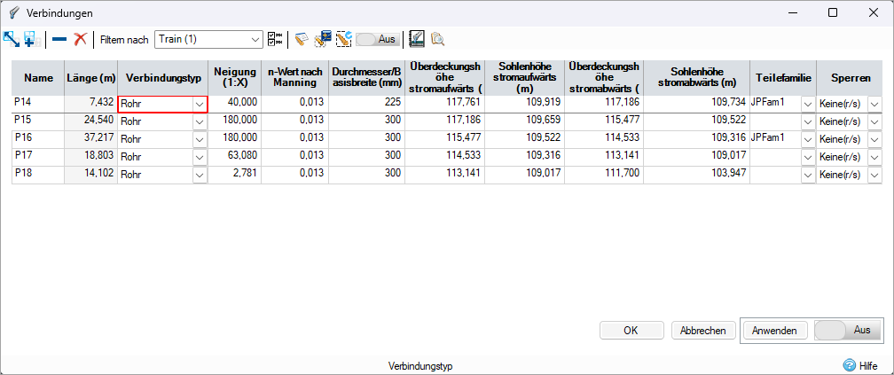 Vorgabemäßig werden die Verbindungen mit den zugehörigen Schächten synchronisiert, um den Sohlenhöhen zu entsprechen.