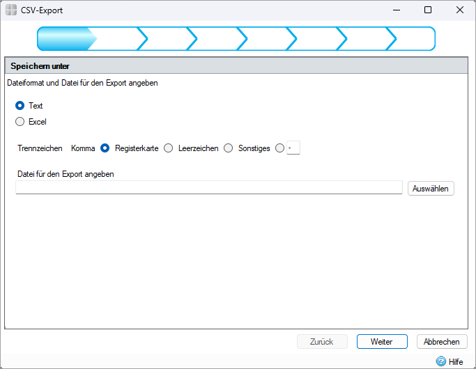 Es gibt einen Assistenten, der den Benutzer durch den CSV-Exportvorgang für Elemente führt. Der Assistent zeigt eine Reihe von Dialogfeldern an, die den Benutzer durch eine klar definierte Schrittfolge führen. Um die Schritte im Assistenten zu durchlaufen, klicken Sie auf Weiter. Um zu einem zuvor abgeschlossenen Schritt zurückzukehren, klicken Sie auf Zurück.