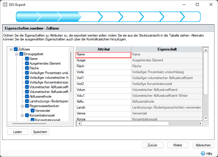 In diesem Schritt wird ein Steuerelement gezeigt, mit dem die InfoDrainage-Eigenschaften Spalten in den exportierten Dateien zugeordnet werden können. Auf der linken Seite des Steuerelements wird eine Strukturansicht der Eigenschaften des zu exportierenden Objekts angezeigt. Auf der rechten Seite des Steuerelements wird eine Tabelle mit Attributen angezeigt, die geschrieben werden.