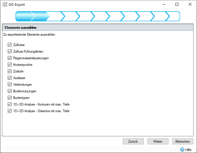 Wenn ein Elementtyp für den Export ausgewählt wurde, der mehrere zu exportierende Elementtypen enthält (z. B. Phase), kann der Benutzer in diesem Schritt die zu exportierenden Elemente auswählen. Durch die Auswahl hier wird die verbleibende Anzahl der Assistentenschritte geändert.