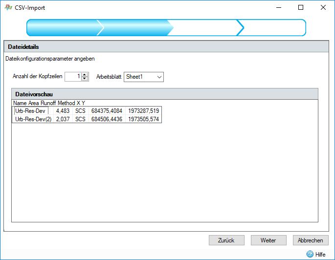 Die Anzahl der Kopfzeilen kann angegeben werden. Dies ist die Anzahl der Zeilen, die nicht als Attributdaten importiert werden. Die letzte Kopfzeile ist die Zeile, die die Spaltenüberschriften enthält.