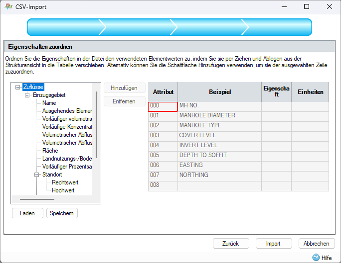 Der CSV-Importassistent erleichtert den Import InfoDrainage-Elementen aus Text- oder Excel-Dateien.