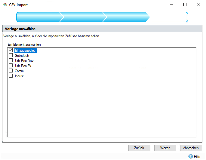 In diesem Schritt wird eine Liste von Vorlagen angezeigt, die zum Erstellen von Objekten aus den importierten Daten verwendet werden können. Bei diesen Vorlagen kann es sich um vordefinierte oder vom Benutzer erstellte Typen handeln. Die ausgewählte Vorlage wird zum Erstellen der Objekte für die importierten Elemente verwendet. Beachten Sie, dass Sie nur Eigenschaften importieren können, die für die ausgewählte Vorlage gültig sind. Wenn Sie beispielsweise Eigenschaften von SCS-Abflussmethoden für ein Einzugsgebiet importieren möchten, stellen Sie sicher, dass für die ausgewählte Vorlage SCS als Abflussmethode ausgewählt ist.