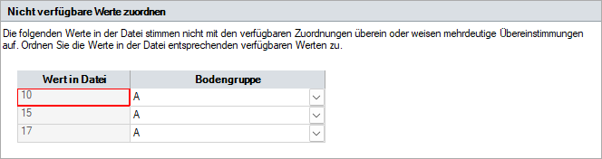 InfoDrainage versucht, die aus der Text-/Excel-Datei gelesenen Attributwerte den verfügbaren InfoDrainage-Eigenschaftsoptionen für die importierten Elemente zuzuweisen. Wenn für einen oder mehrere der Text-/Excel-Attributwerte keine geeignete Zuordnung gefunden wird, wird eine weitere Zuordnungsseite angezeigt, auf der eine Verknüpfung vorgenommen werden kann.
