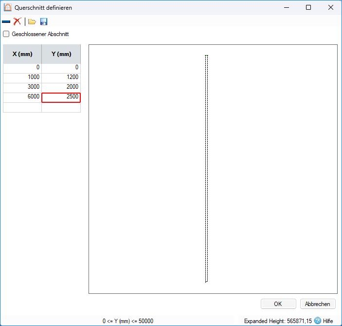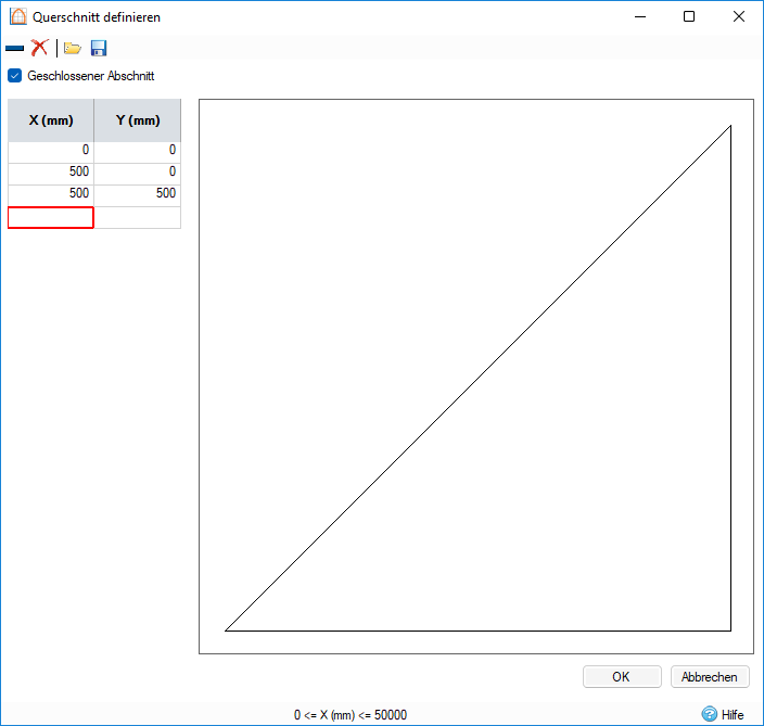 Entfernt die ausgewählte Zeile aus der Koordinatentabelle und den entsprechenden Punkt in der Querschnittsvorschau.