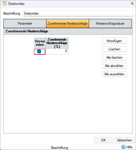 Hiermit wird der gesamte Niederschlag um die angegebene Menge skaliert. Diese Option kann verwendet werden, um Klimaveränderungen oder andere Faktoren zu berücksichtigen.