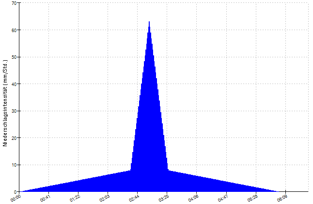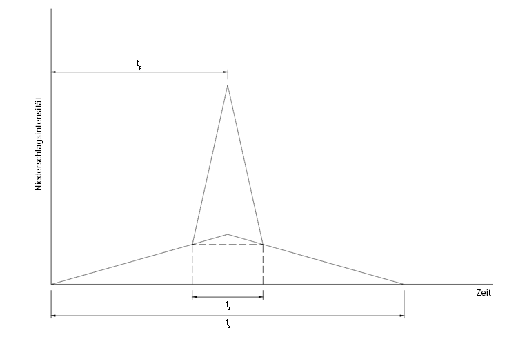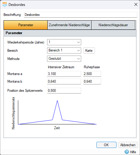 Dieser Parameter beschreibt die Position des Spitzenwerts des Dreiecks für den intensiven Zeitraum innerhalb der gesamten Ereignisdauer. Vorgabemäßig ist der Wert 0.5 ausgewählt, was bedeutet, dass der Spitzenwert in der Mitte des Niederschlagsereignisses auftritt (symmetrischer Hyetograf). Der angegebene Wert gilt für alle ausgewählten Dauern.