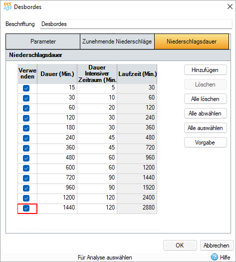 Es muss ein Satz von Niederschlagsdauern und Laufzeiten angegeben werden, damit die Analyse fortlaufend durchgeführt werden kann. Alle Werte für die Dauer können bearbeitet werden. Für zusätzliche Zeiträume können weitere Zeilen hinzugefügt werden.
