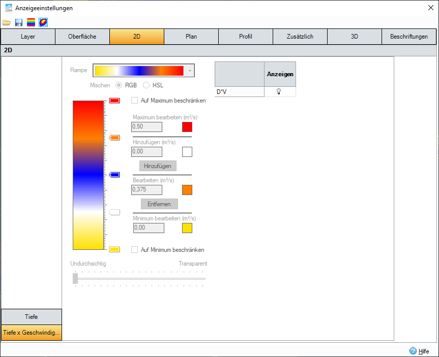 Elemente auf dieser Registerkarte können erst bearbeitet werden, nachdem eine 2D-Analyse durchgeführt wurde. Sie werden nicht für die Überschwemmungsanalyse verwendet.