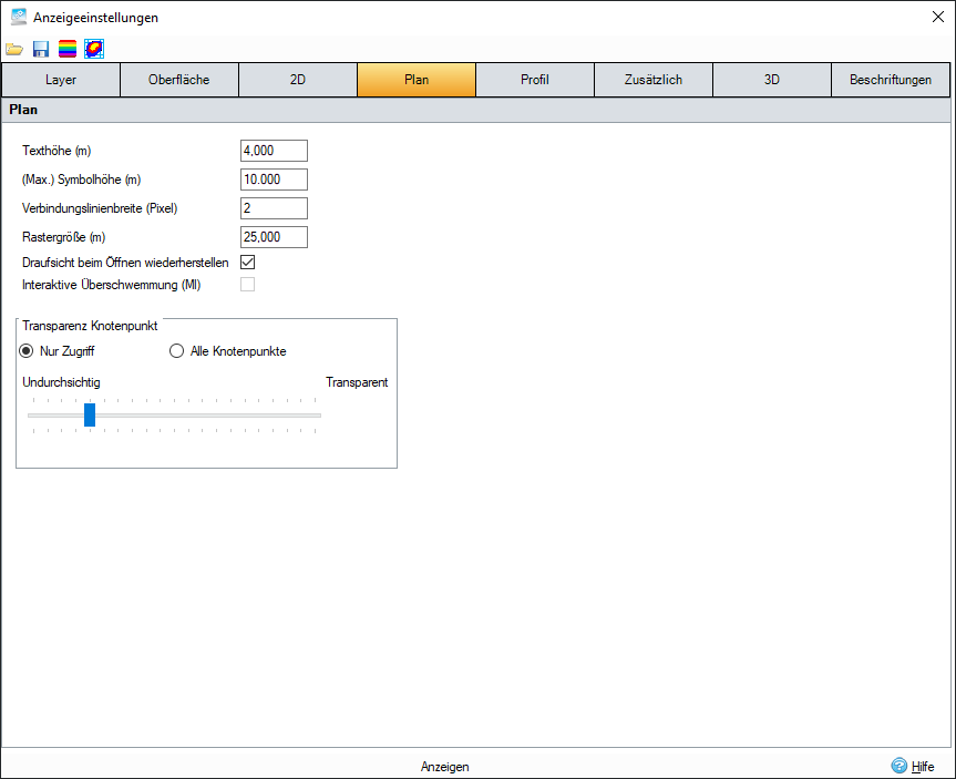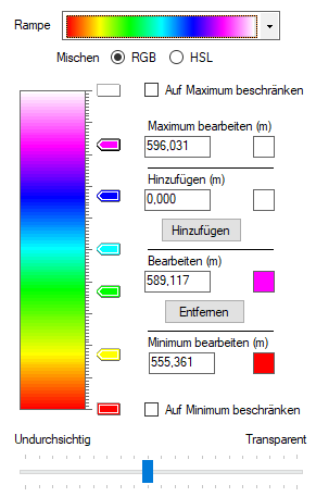 Durch Verschieben des Schiebereglers wird die Transparenz der Farben im Plan eingestellt. Die Einstellung für die Transparenz wird nicht im Farbverlauf widergespiegelt.