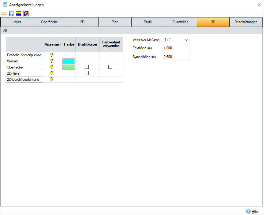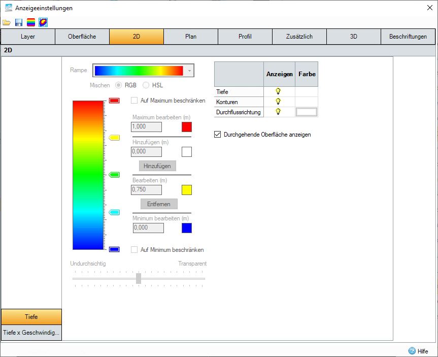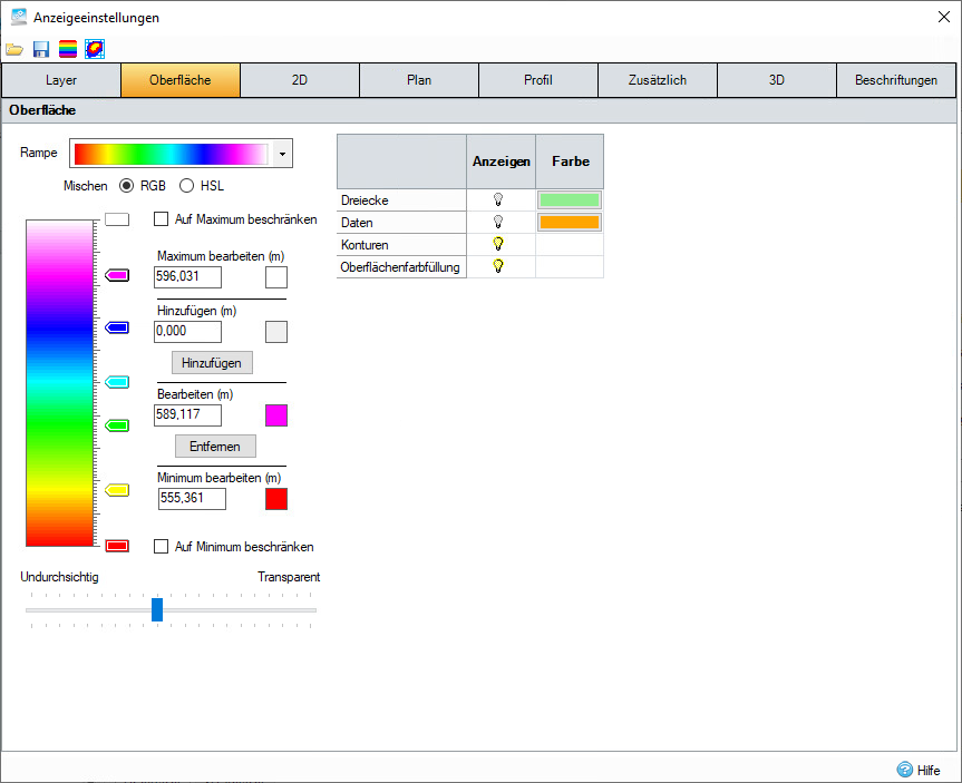 Die Tabelle bestimmt die Sichtbarkeit und Farbe der aufgeführten Layerelemente. Der Farbverlauf bestimmt die Farben der Konturen und der Farbfüllung, die für einen bestimmten Satz von Oberflächendaten gerendert werden können.