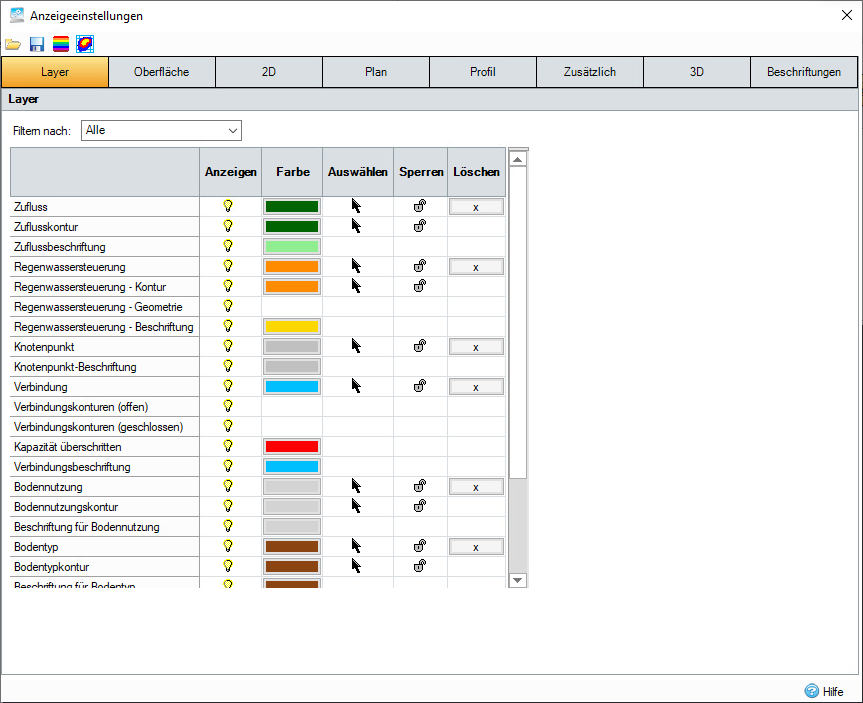 Diese Tabelle bestimmt die Sichtbarkeit, Anzeigefarbe und Objektsteuerung der aufgeführten Layerelemente.