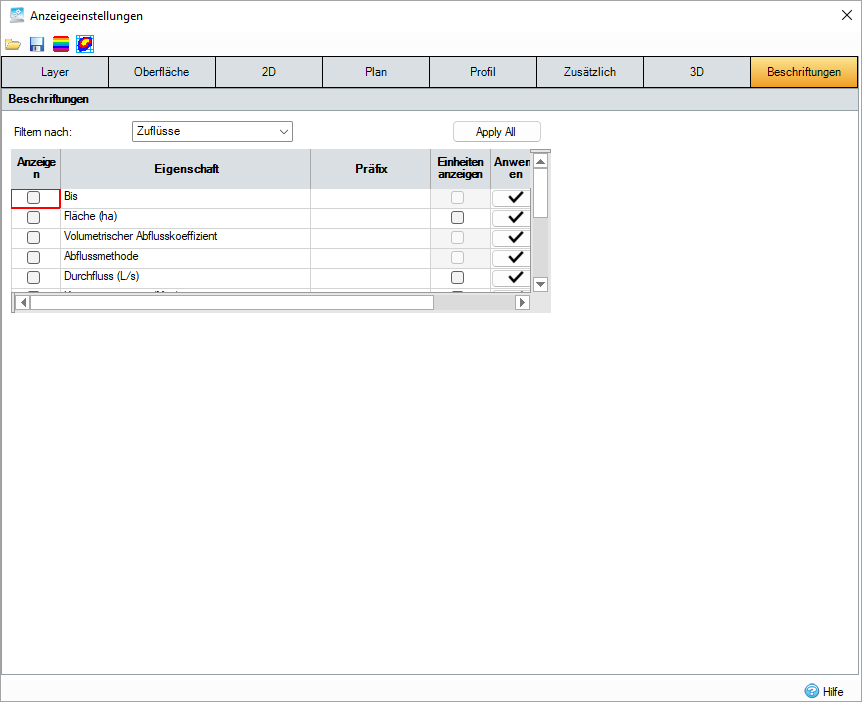 Die Tabelle bestimmt die Anzeige von Beschriftungen für die verschiedenen Elementtypen in der Draufsicht.