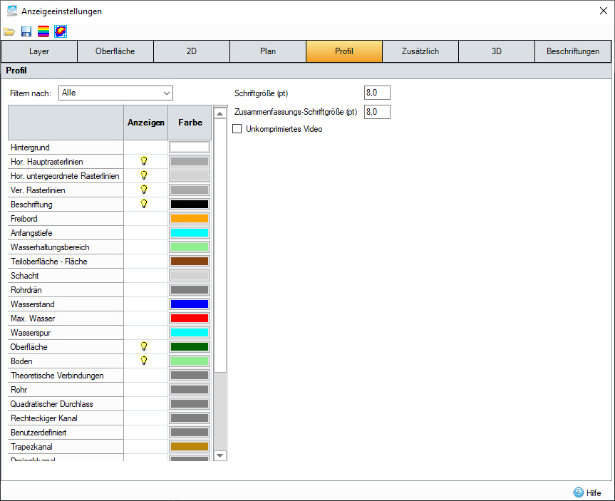 Die Tabelle bestimmt die Farben der Elemente in der Profilansicht sowohl im primären Fenster als auch im Formular Profil plotten.