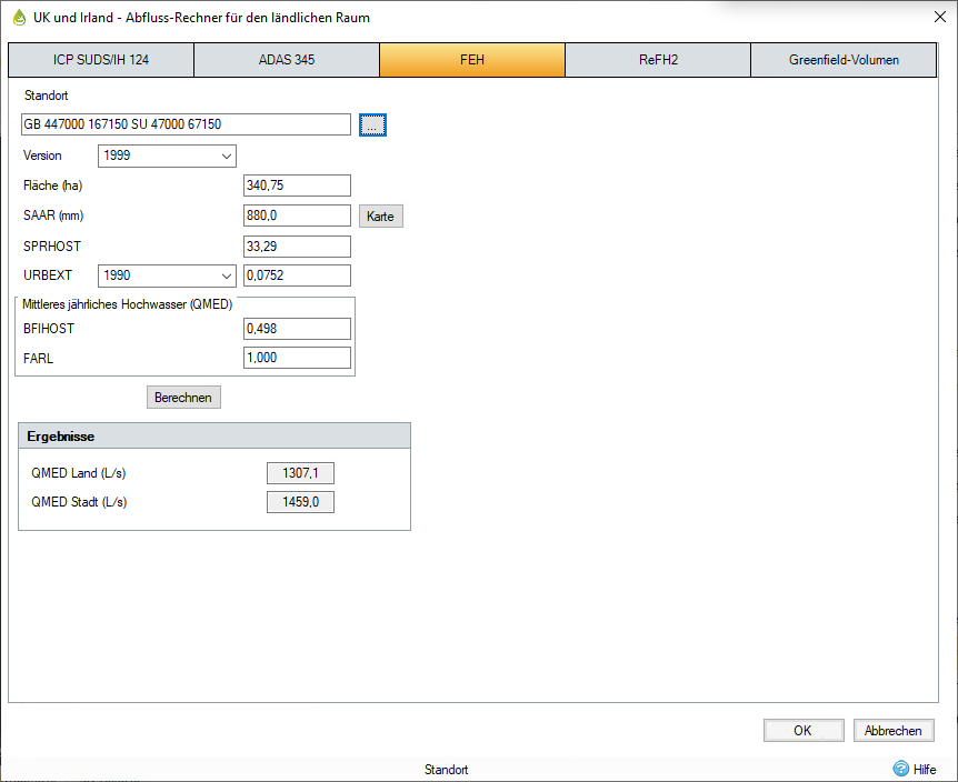 Die Genauigkeit von QMED bei Berechnung aus den oben genannten Einzugsgebietsdeskriptoren kann durch Datenübertragung aus Ausgangseinzugsgebieten erheblich verbessert werden. Diese Methode wird in FEH, Band 3, Kapitel 4 ausführlich beschrieben.