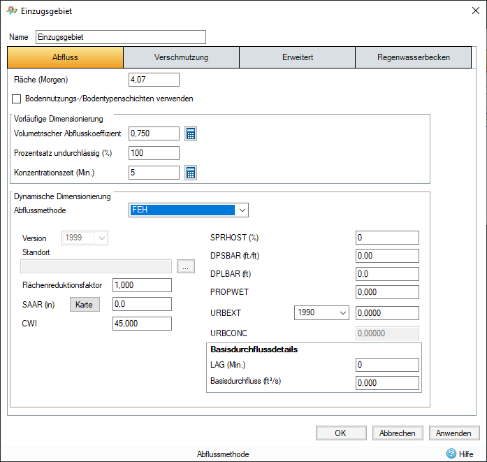 Flächenreduktionsfaktor: Reduziert den Niederschlag, da er als Punktniederschlag basierend auf Zeit und Fläche berechnet wird. Der Wert kann der FEH-Abbildung 4.3.4 entnommen werden.