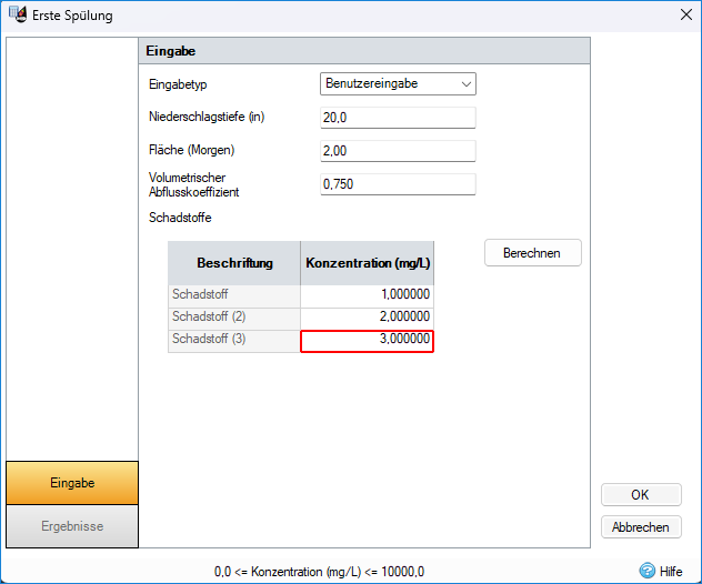 Die erste Spülung ist der erste Oberflächenabfluss aus einem Niederschlagsereignis. Der Abtrag von Verschmutzungen für undurchlässige Oberflächen findet in dieser Anfangsphase voraussichtlich in einer höheren Konzentration statt und wird als Verschmutzungsschock bezeichnet. Der Zweck des Rechners für die erste Spülung besteht darin, den Benutzern die Möglichkeit zu geben, diese Verschmutzungswerte für eine anfängliche Wassertiefe zu ermitteln.