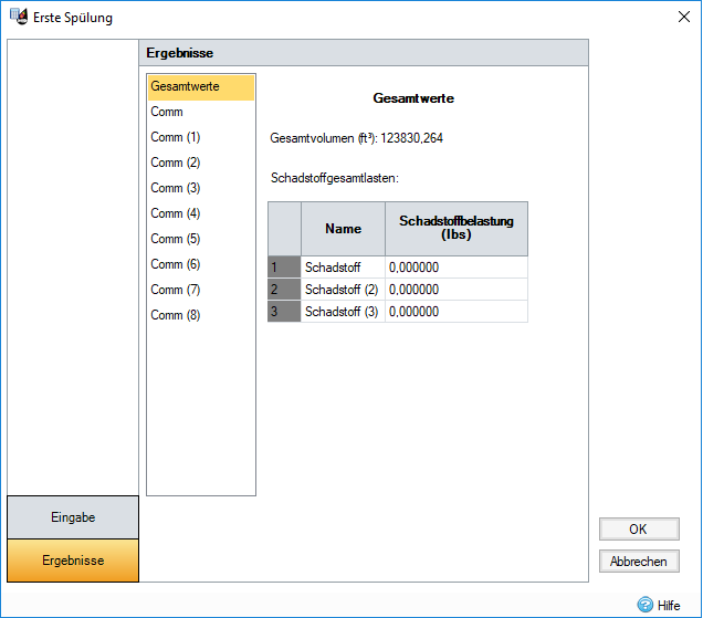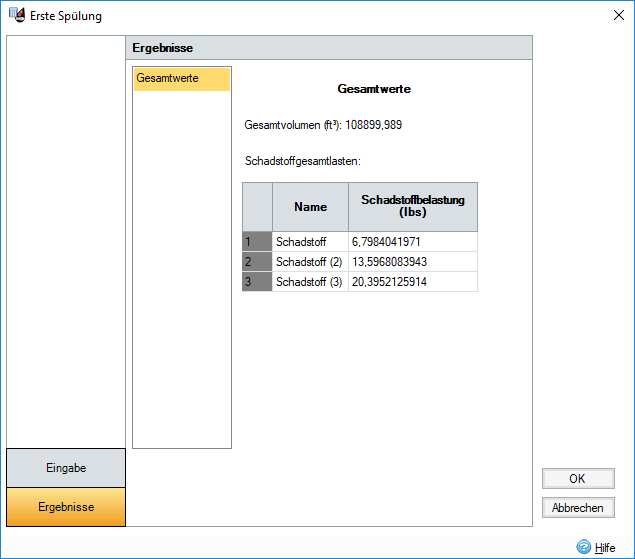 Die berechneten Werte für Gesamtvolumen und die gesamte Schadstoffbelastung werden dann auf der Registerkarte Berichte in Tabellenform dargestellt, siehe Abb. 1 unten: