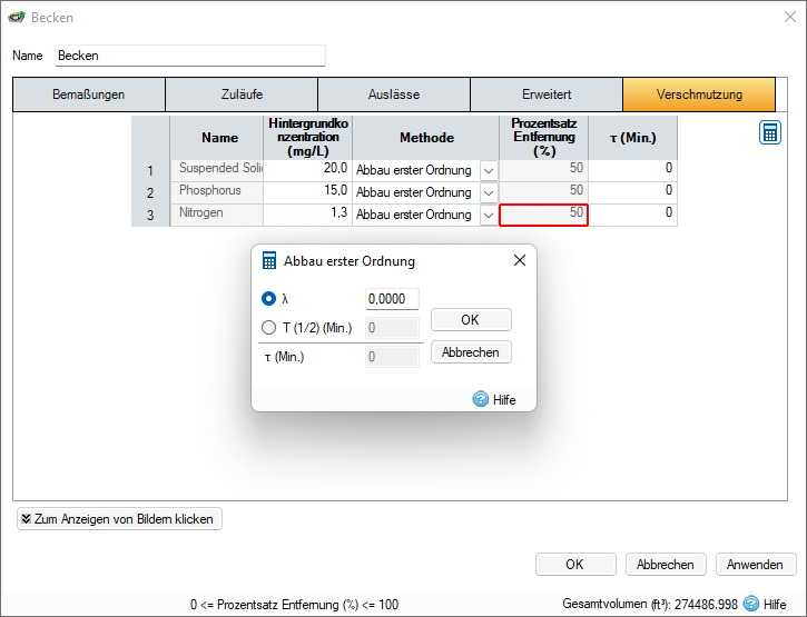 Abbau erster Ordnung ist eine komplexere Methode zur Analyse der Schadstoffbeseitigung auf Grundlage des exponentiellen Abklingens. Die Methode muss auf die Wasserfläche in jeder Regenwassersteuerung und nicht auf die Ausgabe angewendet werden. Sie bestimmt den Prozentsatz der entfernten Schadstoffe in Abhängigkeit von der Zeit, die das Wasser benötigt, um die Regenwassersteuerung zu durchlaufen.