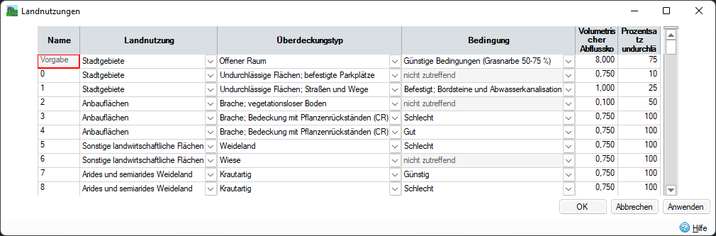 Die oberste Zeile der Tabelle enthält die Eigenschaften für Vorgabe-Landnutzung, die von allen Zuflussflächen verwendet werden, die im Entwurf nicht durch Landnutzung abgedeckt sind.