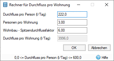 Mit dem Rechner für den Volumenstrom pro Wohnung können Sie die Eigenschaft Volumenstrom pro Wohnung eines Sanitärabflusses mithilfe der folgenden Berechnung festlegen: