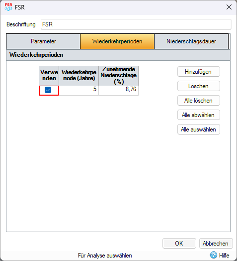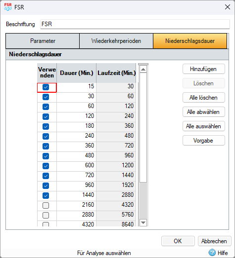 Es muss ein Satz von Niederschlagsdauern und Laufzeiten angegeben werden, damit die Analyse fortlaufend durchgeführt werden kann.