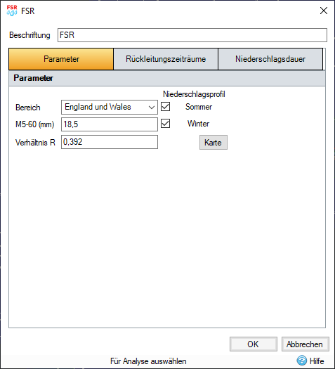 InfoDrainage unterstützt zwei UK-Niederschlagsmethoden. Der Flood Studies Report (FSR) wurde Mitte der 1970er Jahre veröffentlicht und verwendet Niederschläge von 1941 bis 1970. Das Flood Estimation Handbook (FEH) wurde 1999 veröffentlicht und verwendet Niederschläge aus einem Datensatz der Jahre 1961 bis 1990.