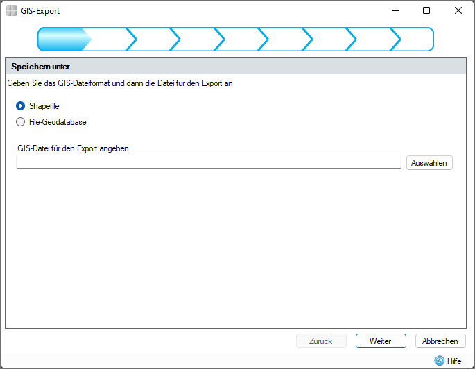 Es gibt einen Assistenten, der den Benutzer durch den Exportvorgang für GIS-Elemente führt. Der Assistent zeigt eine Reihe von Dialogfeldern an, die den Benutzer durch eine klar definierte Schrittfolge führen. Um die Schritte im Assistenten zu durchlaufen, klicken Sie auf Weiter. Um zu einem zuvor abgeschlossenen Schritt zurückzukehren, klicken Sie auf Zurück.