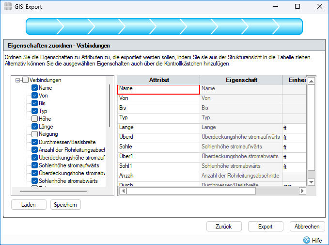 In diesem Schritt wird ein Steuerelement gezeigt, mit dem die InfoDrainage-Eigenschaften Attributen in den exportierten GIS-Tabellen zugeordnet werden können. Auf der linken Seite des Steuerelements wird eine Strukturansicht der Eigenschaften des zu exportierenden Objekts angezeigt. Auf der rechten Seite des Steuerelements wird eine Tabelle mit Attributen angezeigt, die in die GIS-Tabellen geschrieben werden.