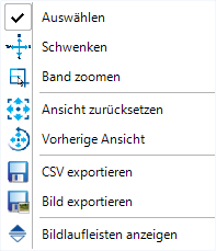 CSV exportieren: Exportiert alle aktiven Reihen in einzelne CSV-Dateien. Nach Eingabe eines Dateinamens zum Speichern wird für jede Datenreihe eine Datei im folgenden Format erstellt: Eingabename_Reihenname.csv.