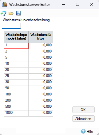 Der Wachstumskurven-Editor ermöglicht Ihnen die Eingabe von Wachstumskurvenfaktoren für die Methoden ICP SUDS, IH 124 und ADAS 345.