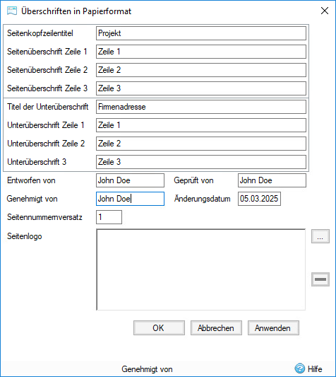 Seitenkopfzeilentitel: Die drei Hauptüberschriftszeilen können mit einem vom Benutzer eingegebenen Titel versehen werden. Die Vorgabe lautet Projekt.