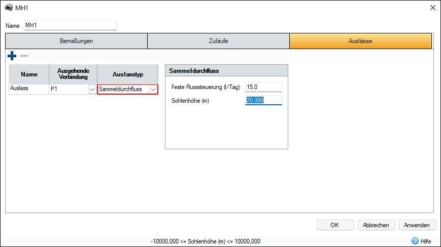 Der Auslass Sammelvolumenstrom ist eine Art feste Volumenstromsteuerung. Die konstante Volumenstrommenge tritt auf, wenn der Wasserstand die Sohlenhöhe überschreitet.