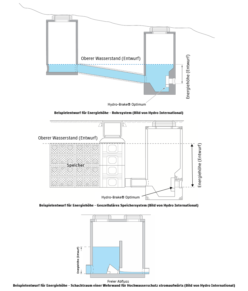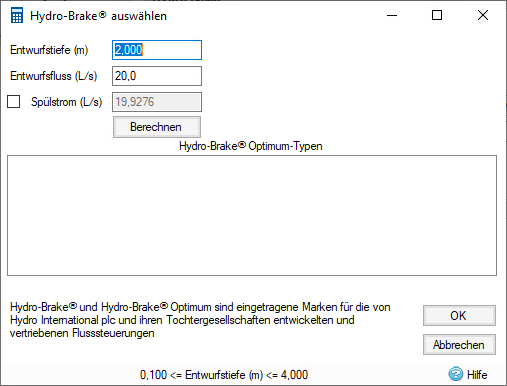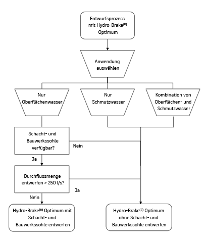 Die Auswahl der am besten geeigneten Hydro-Brake® Optimum-Volumenstromsteuerung für eine bestimmte Anwendung hängt von einer Reihe von Überlegungen ab, einschließlich der Art des Abwassersystems, den hydraulischen Eigenschaften der Vorrichtung, den Vorrichtungsabständen und den physischen Gesamtbemaßungen. Das Programm bietet Ausgaben für die hydraulischen Eigenschaften und die Auslassgröße. Abhängig von der jeweiligen Anwendung der Hydro-Brake® Optimum wird die Einheit in der passenden Ausführungsvariante im Planungsprozesses für die Volumenstromsteuerung ausgewählt.