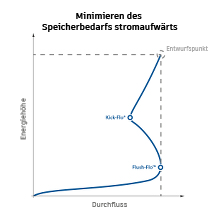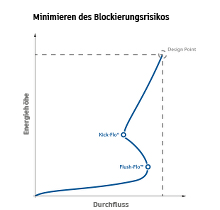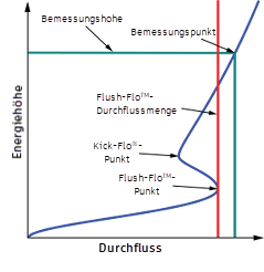 Im Allgemeinen sollten alle Hydro-Brake® Optimum-Volumenstromsteuerungen so ausgelegt sein, dass der Nutzvolumenstrom/Bemessungsvolumenstrom an keinem Punkt auf der Energiehöhen-Volumenstrom-Kurve überschritten wird.