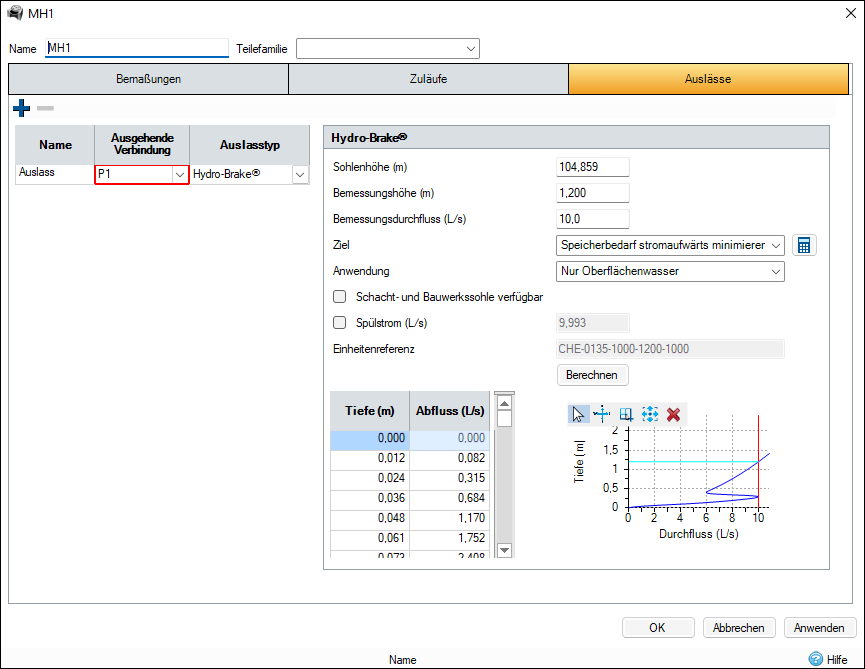 Bemessungshöhe: Gewünschte Bemessungshöhe der Steuerung (bei der der Wirbel vollständig ausgeprägt ist). Dieser Wert sollte als Tiefe oberhalb der Sohlenhöhe der Steuerung eingegeben werden und variiert bei den unterschiedlichen Strukturen und Schächten je nach Tiefe der Speicherstruktur und dem gewünschtem Freibord.