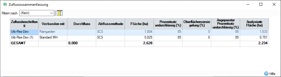klicken, werden zusätzliche Informationen im Formular Zuflusszusammenfassung angezeigt, einschließlich Oberflächenversiegelung, Prozentsatz undurchlässig und Angepasster Prozentsatz undurchlässig.