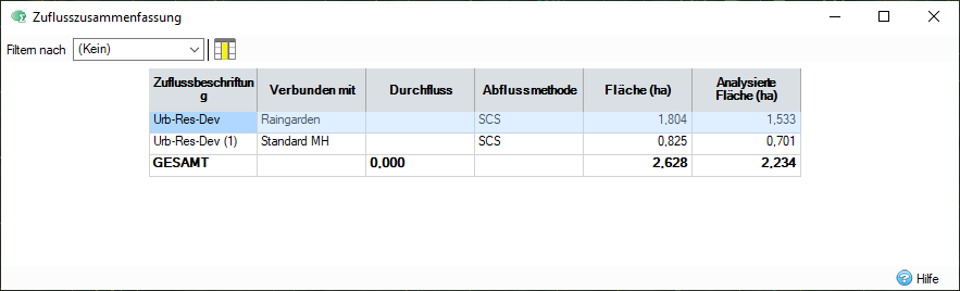 Wenn das Dropdown-Menü Filtern nach auf (Kein) gesetzt ist, zeigt die Zuflusszusammenfassung Informationen für die gesamte Phase an. Alle Einzugsgebiete und Basisvolumenströme innerhalb der Phase werden angezeigt und sind im Gesamtwert enthalten.