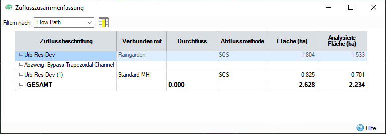 Das Formular Zuflusszusammenfassung zeigt die Informationen zu den Zuflüssen innerhalb einer Phase oder eines Fließwegs an, einschließlich der Gesamtfläche der Einzugsgebiete und des Gesamtvolumenstroms der Basisvolumenströme.