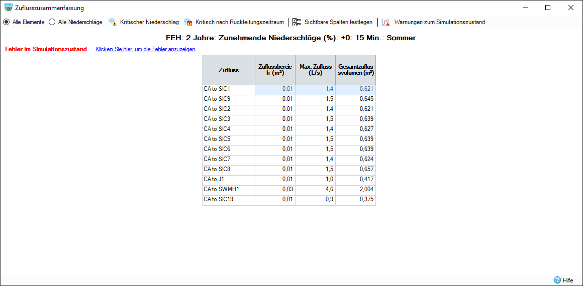Wenn die Analyseergebnisse Probleme beim aktuellen Niederschlag (oder bei einem der Niederschläge, falls kritische/alle Niederschläge angezeigt werden) enthalten, wird oben im Formular eine Meldung angezeigt. Weitere Informationen finden Sie im Abschnitt Simulationszustand.