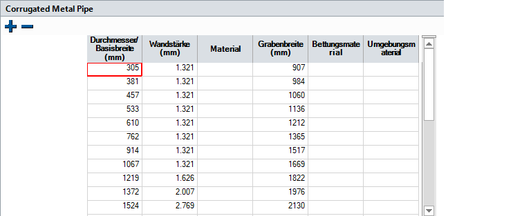 Grabenbreite: Horizontaler Abstand über die Oberkante des Grabens, der für das Rohr ausgehoben wird. Vorgabemäßig wird dieser Wert abhängig von den Einstellungen für die Regionalisierung anhand der folgenden Formeln berechnet: