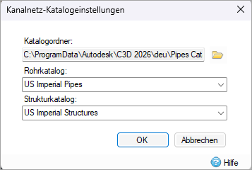 Im Dialogfeld Kanalnetz-Katalogeinstellungen können Sie die Teilefamilien aus einem Civil 3D-Komponentenkatalog-Ordner importieren.