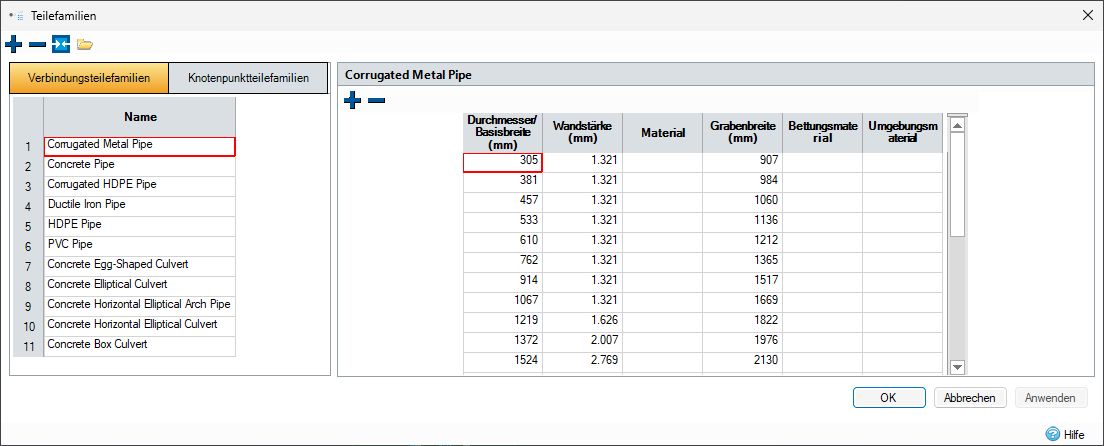 Hinzugefügte Teilefamilien stehen in Verbindungen und Knotenpunkten zur Auswahl zur Verfügung. Die für jedes Objekt ausgewählte Teilefamilie wird in InfoDrainage for Civil 3D verwendet, um Objekte während der Komponentenzuordnung zu gruppieren.