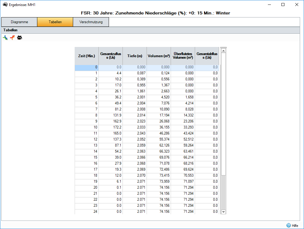 Zeigt die minütlichen Daten aus der Analyse des Systems für Zuflüsse, Abflüsse, Tiefen, Volumen und Schadstoffe an. Mithilfe der Schalter können Sie Spalten nach Bedarf aktivieren und deaktivieren.