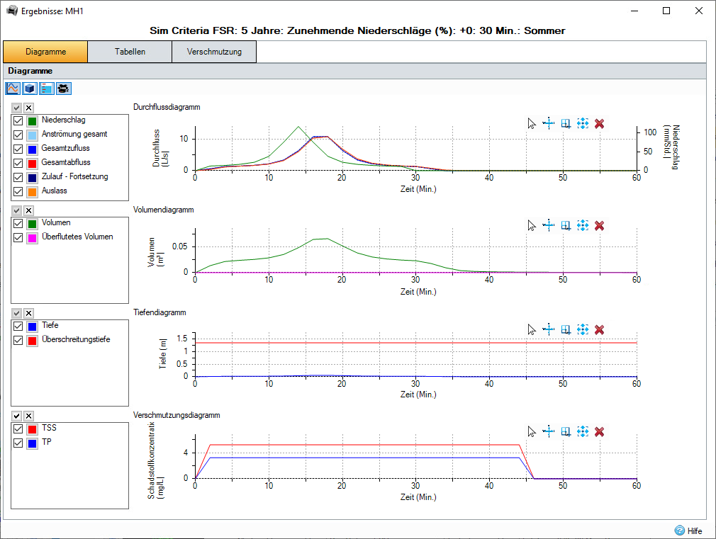 Tiefen: Zeigt die Wassertiefe im Knotenpunkt im Zeitverlauf an. Die Überschreitungstiefe (Überdeckungshöhe - Sohlenhöhe) wird als Referenz angezeigt, um festzustellen, wann eine Überflutung auftritt.