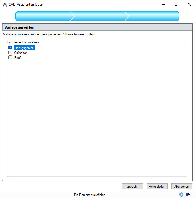Wenn Sie den Assistenten zum Laden von CAD-Daten zum Laden von Flächen von Regenwassersteuerungen, Zuflüssen oder Landnutzungen verwenden, wird ein dritter Schritt im Assistenten angezeigt. In diesem Schritt können Sie eine Vorlage auswählen, auf der die importierten Bereiche basieren.