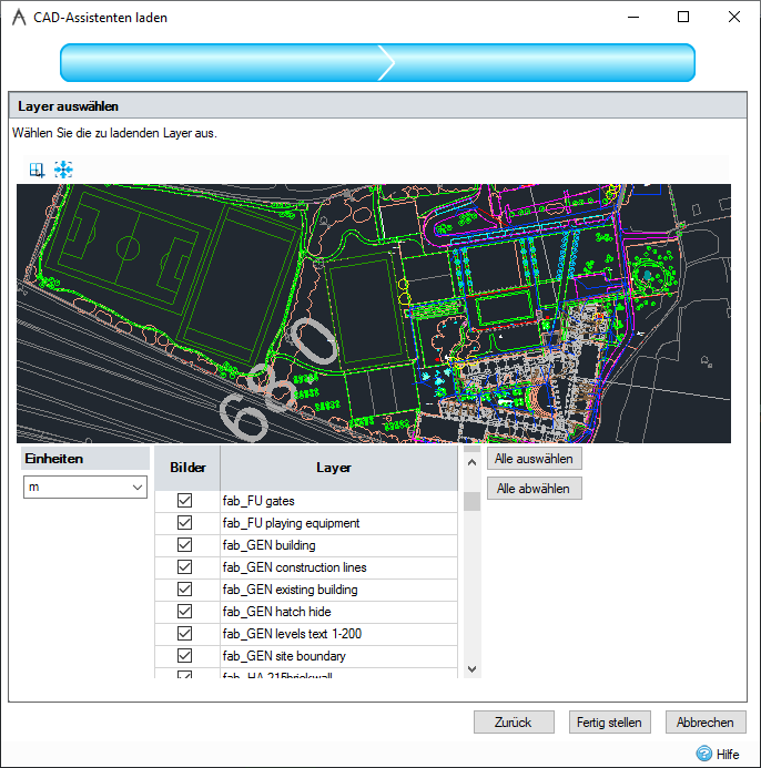 In diesem Schritt können Sie Layer der CAD-Datei vor dem Laden deaktivieren sowie die Einheiten der Datei festlegen, ein Vorschaubild der Datei anzeigen und zusätzliche Optionen beim Laden von Oberflächendaten bereitstellen.
